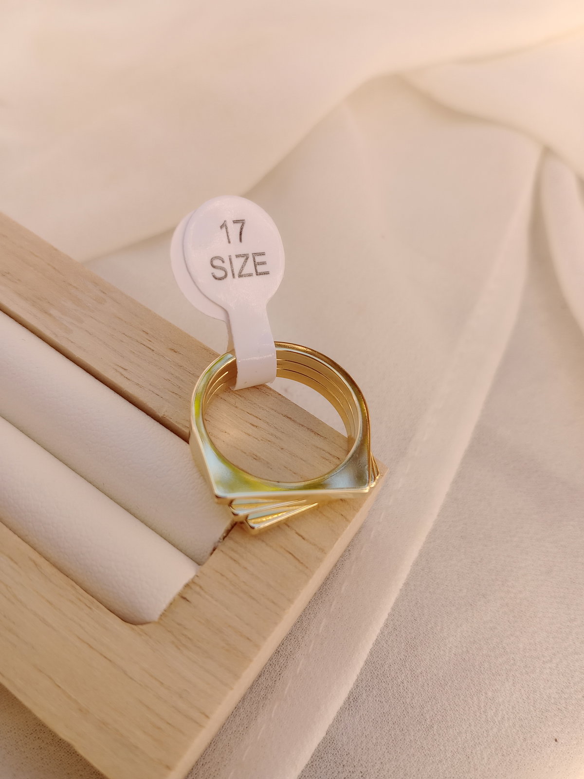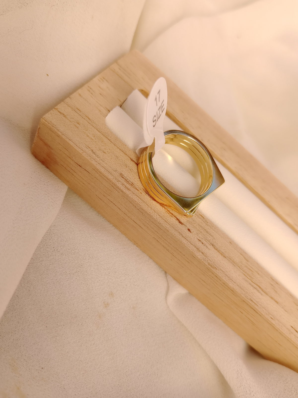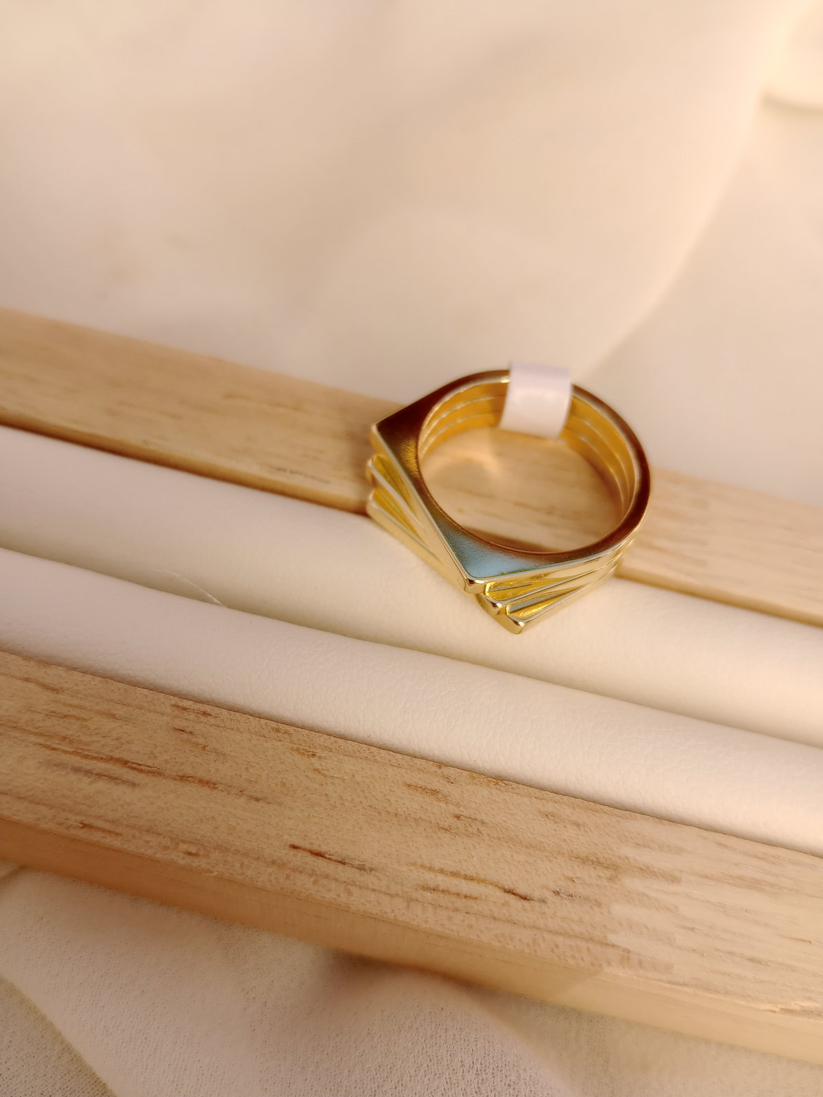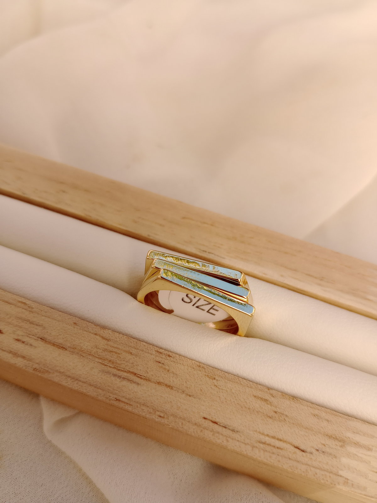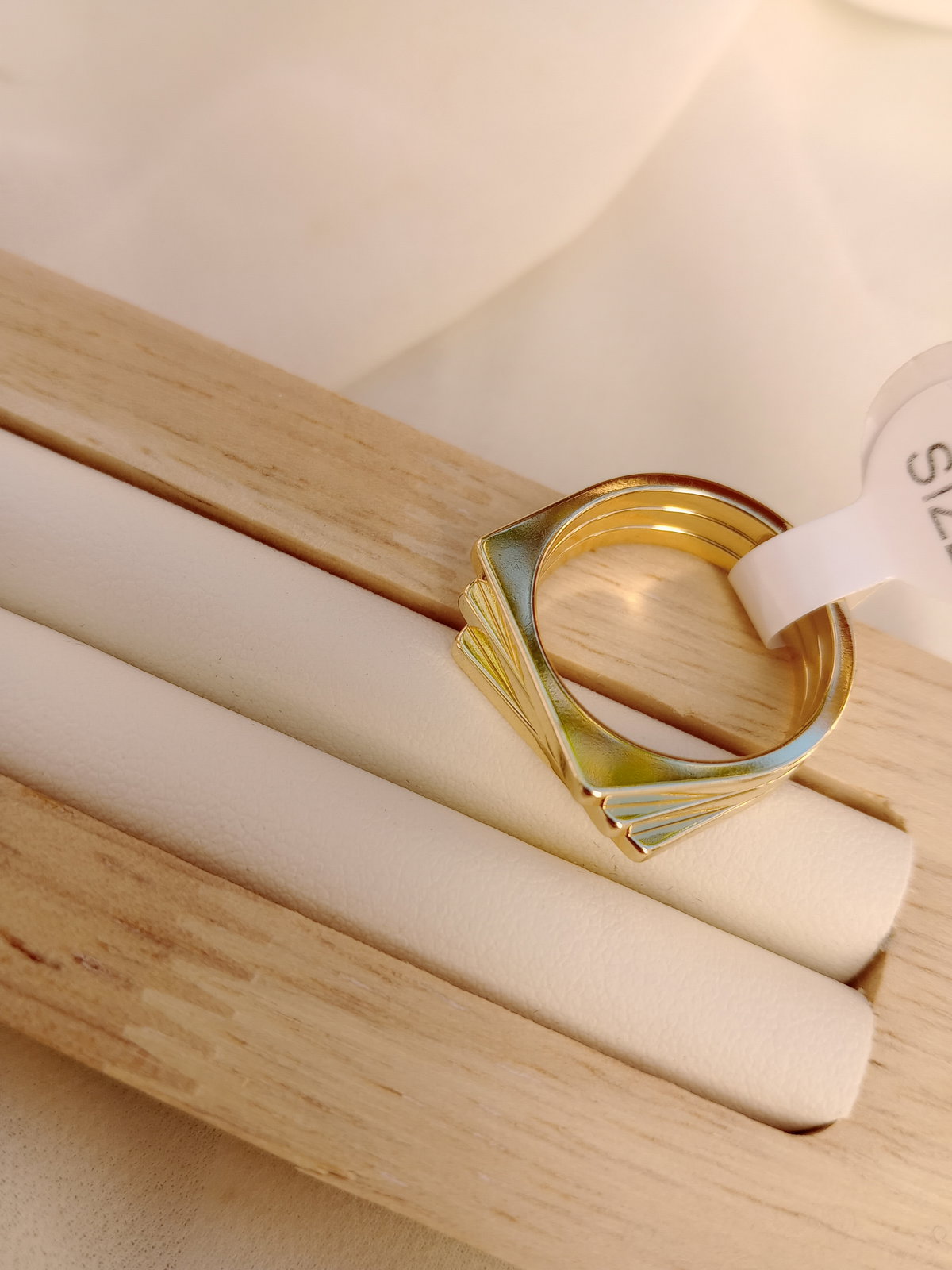 Geométrico 3 en uno. Este anillo sello en acero dorado presenta la sensación de ser 3 anillos en uno. combinando la solidez del diseño cuadrado con un toque de color fresco y moderno. Una pieza que suma carácter a cualquier look sin esfuerzo.