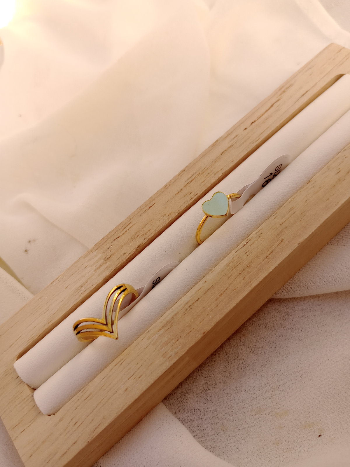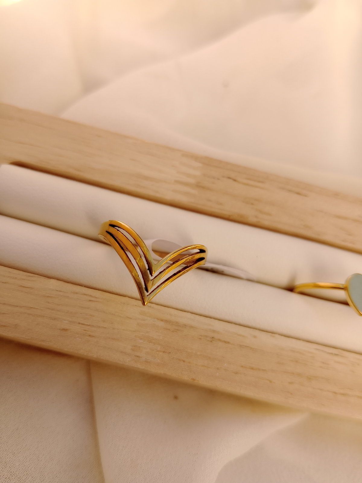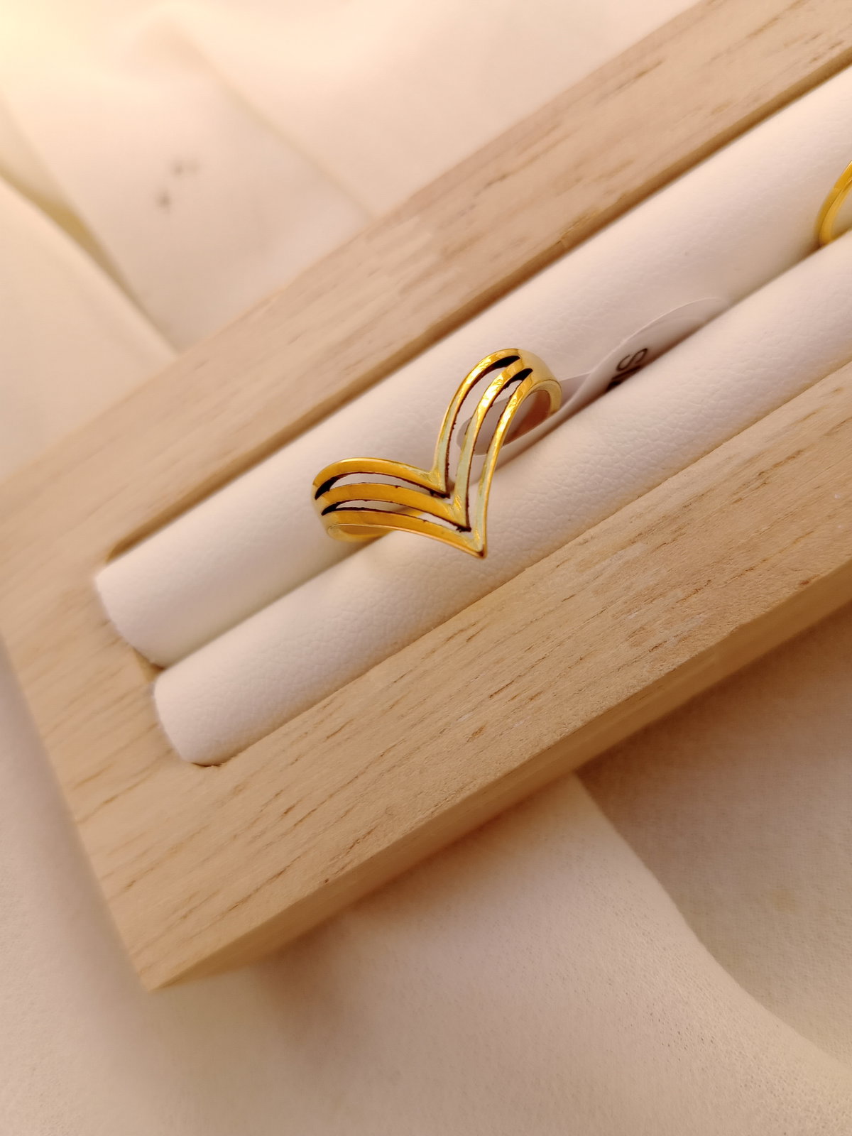 Minimalista y con estilo. El anillo chevron en acero dorado presenta un diseño en V con líneas paralelas que le dan volumen y modernidad. Perfecto para apilar con otros anillos o usar solo como detalle delicado.