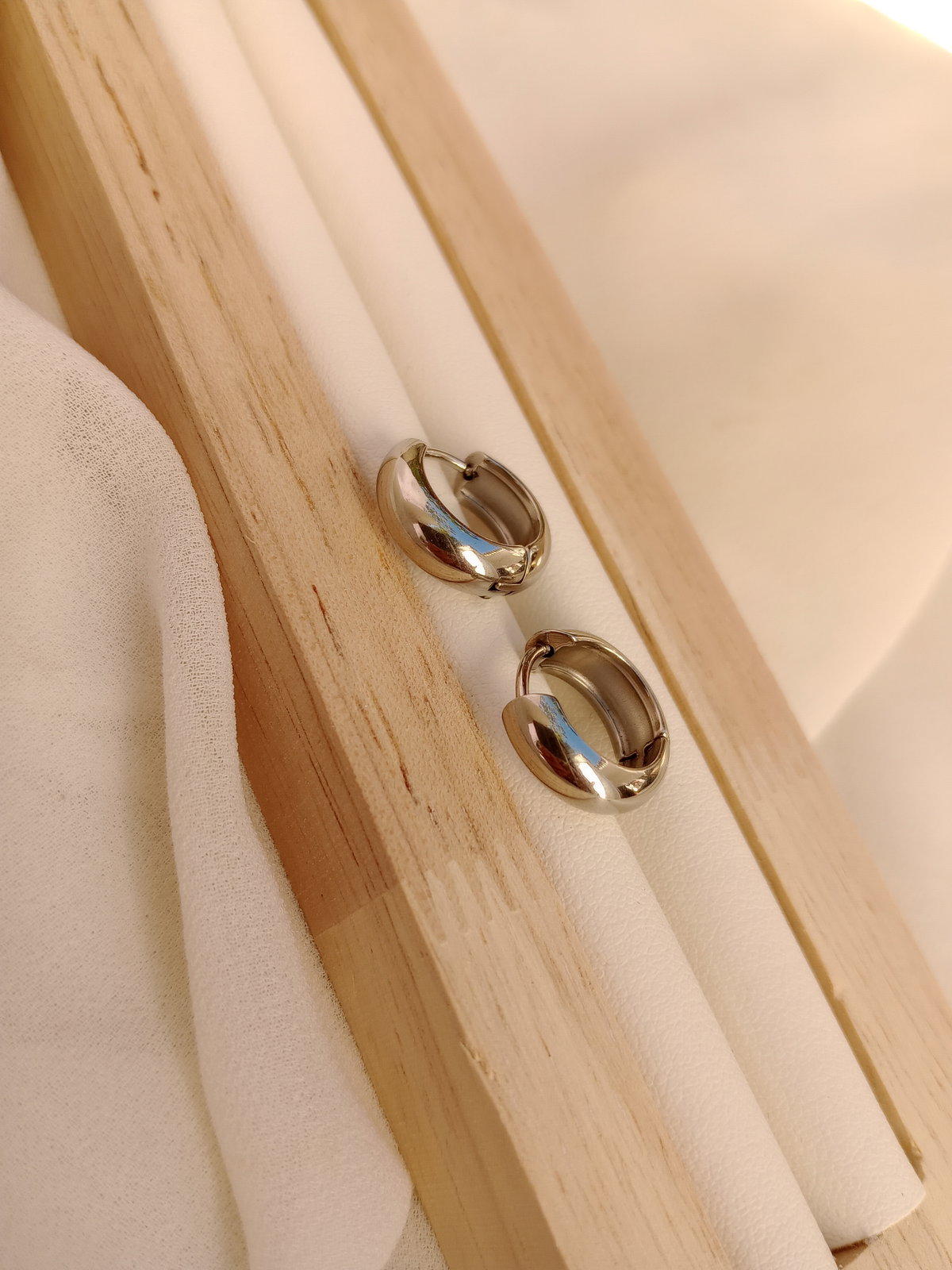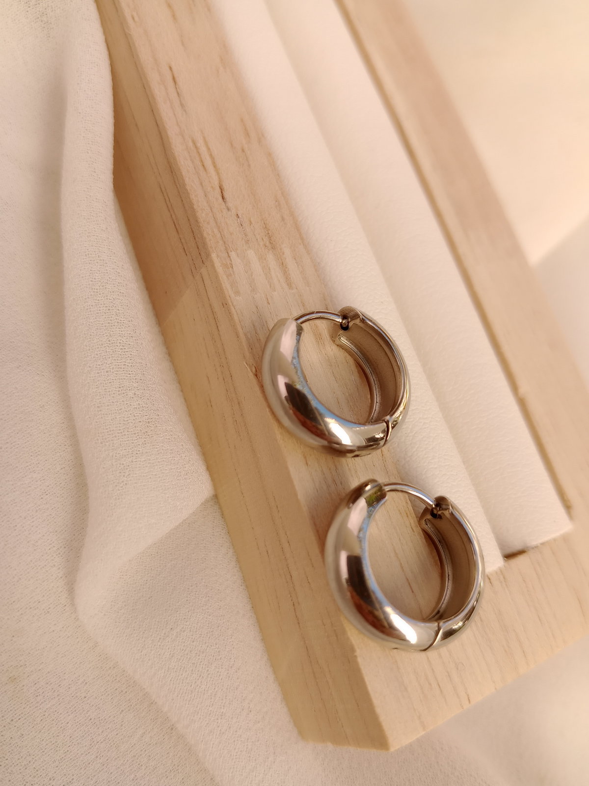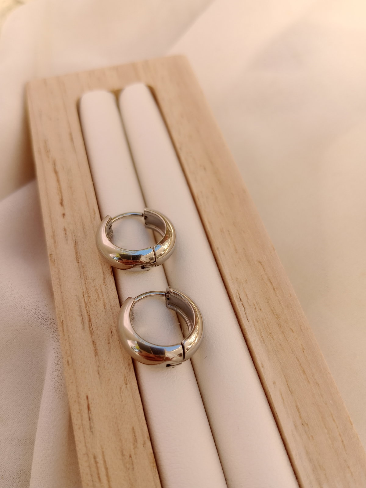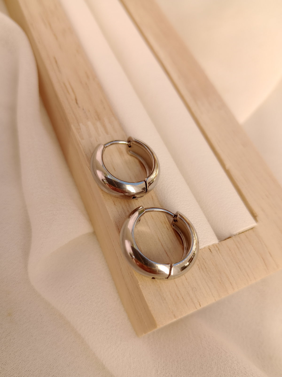 El aro que nunca falla. Los Huggies lisos en acero quirúrgico son la joya esencial para el día a día — abrazan el lóbulo perfectamente con su formato de 14mm, cómodos, seguros y con ese brillo plateado que combina con todo. Ideales para usar solos o combinar con otros aros en un look apilado.