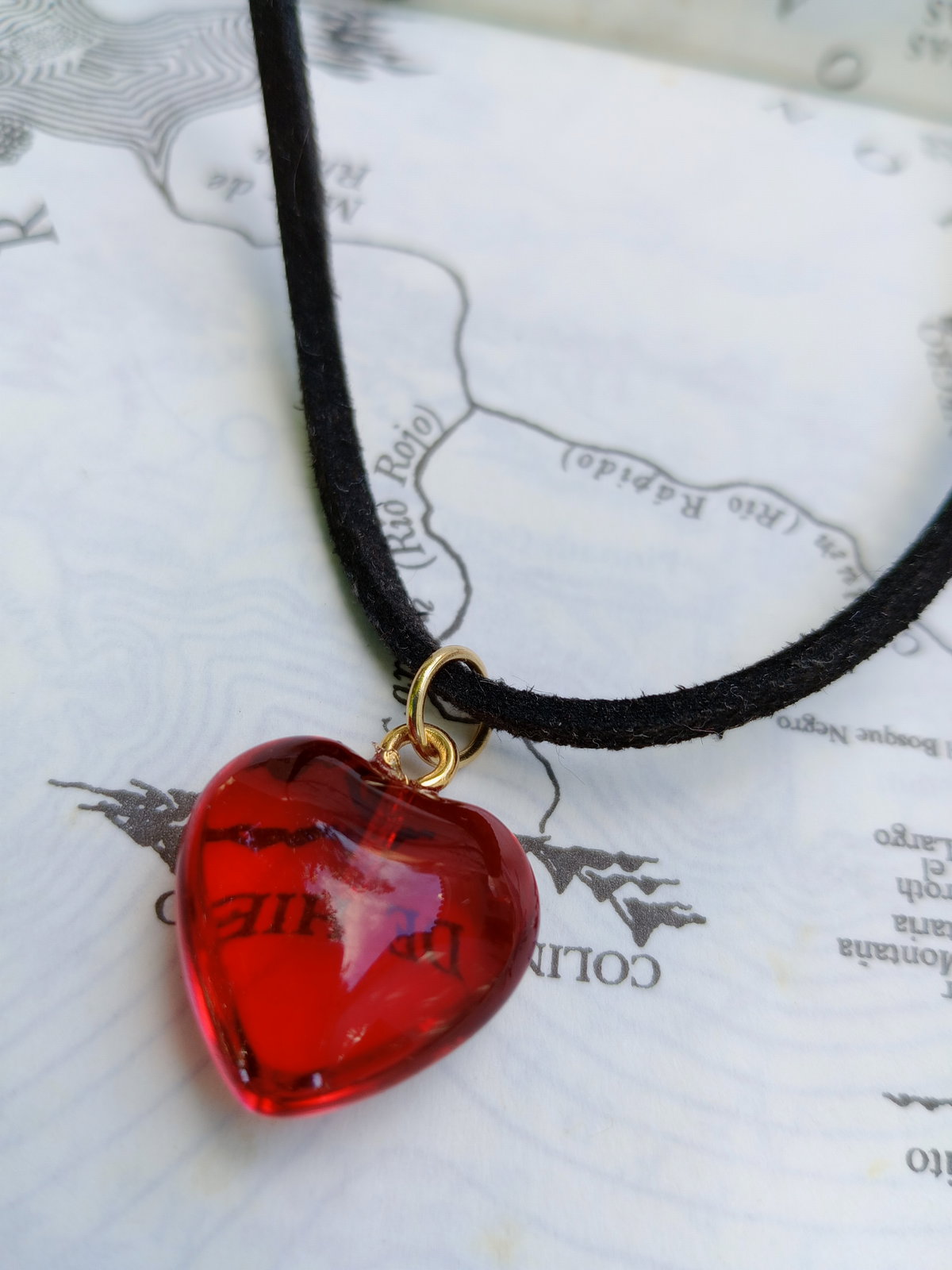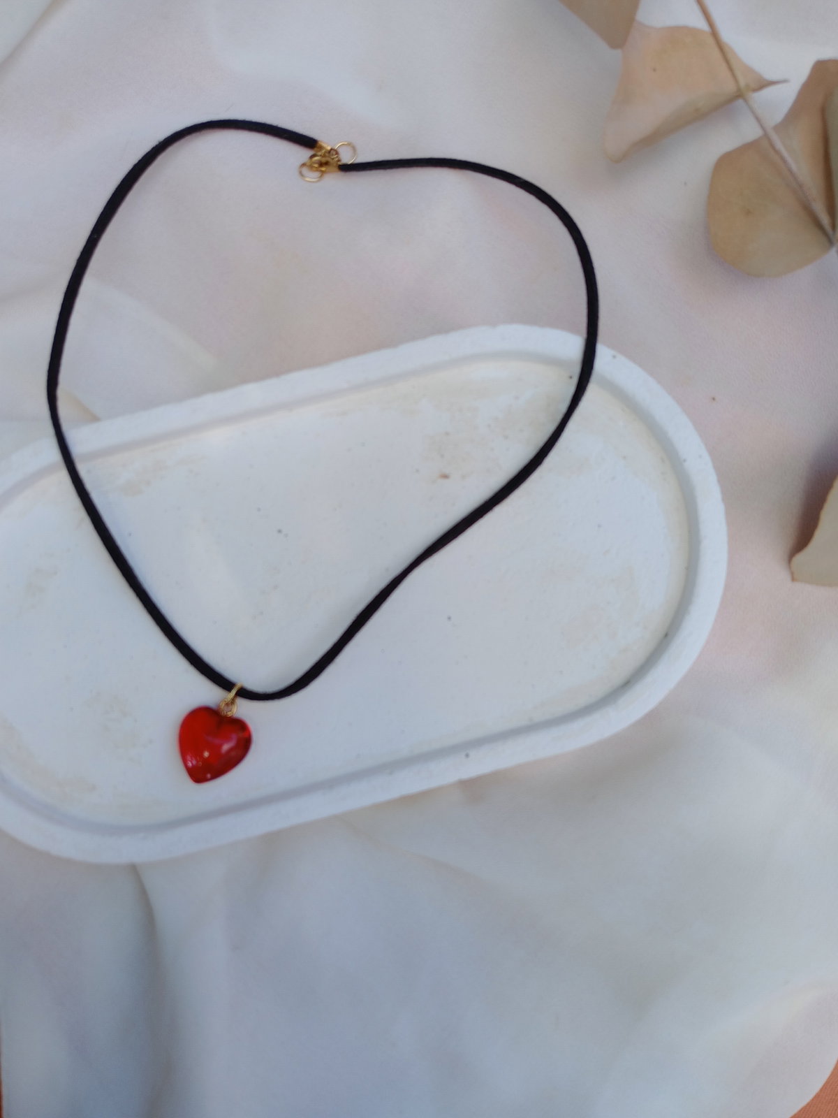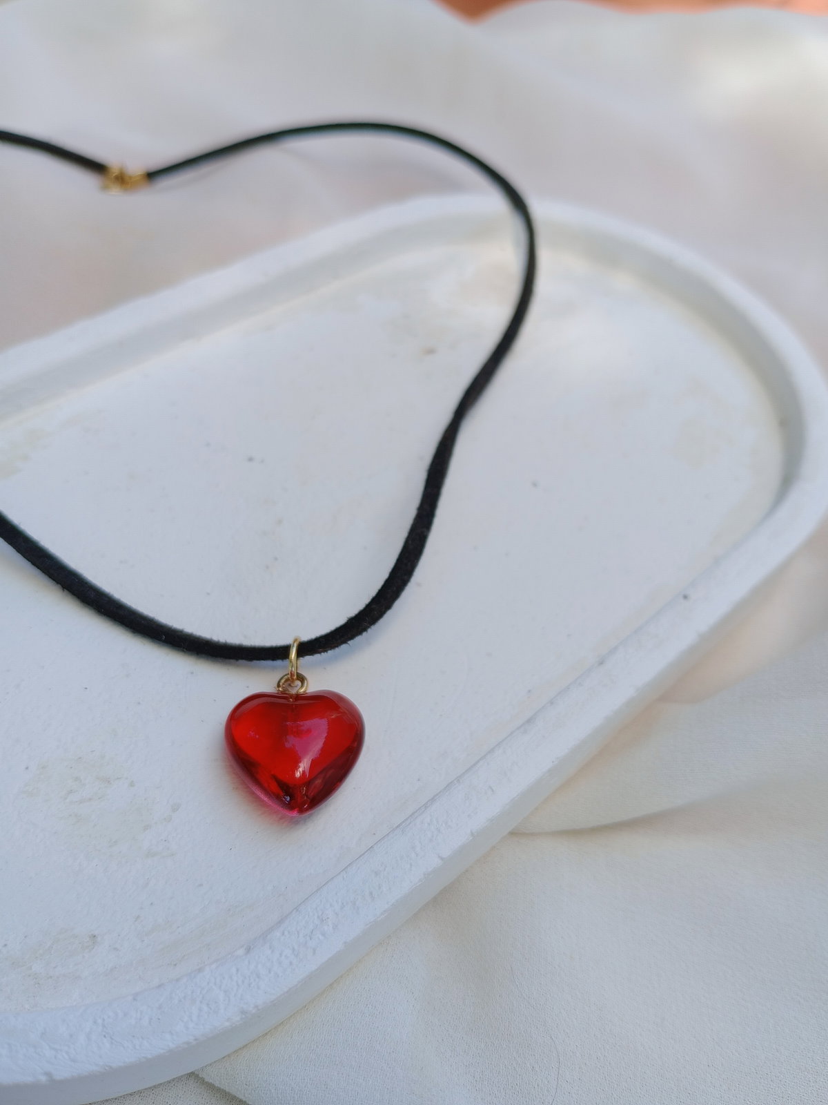 Chocker gamuza con hermoso dije cristal rojo en forma corazón. Largo chocker gamuza 40 CM. Cierres y fornituras en acero dorado.