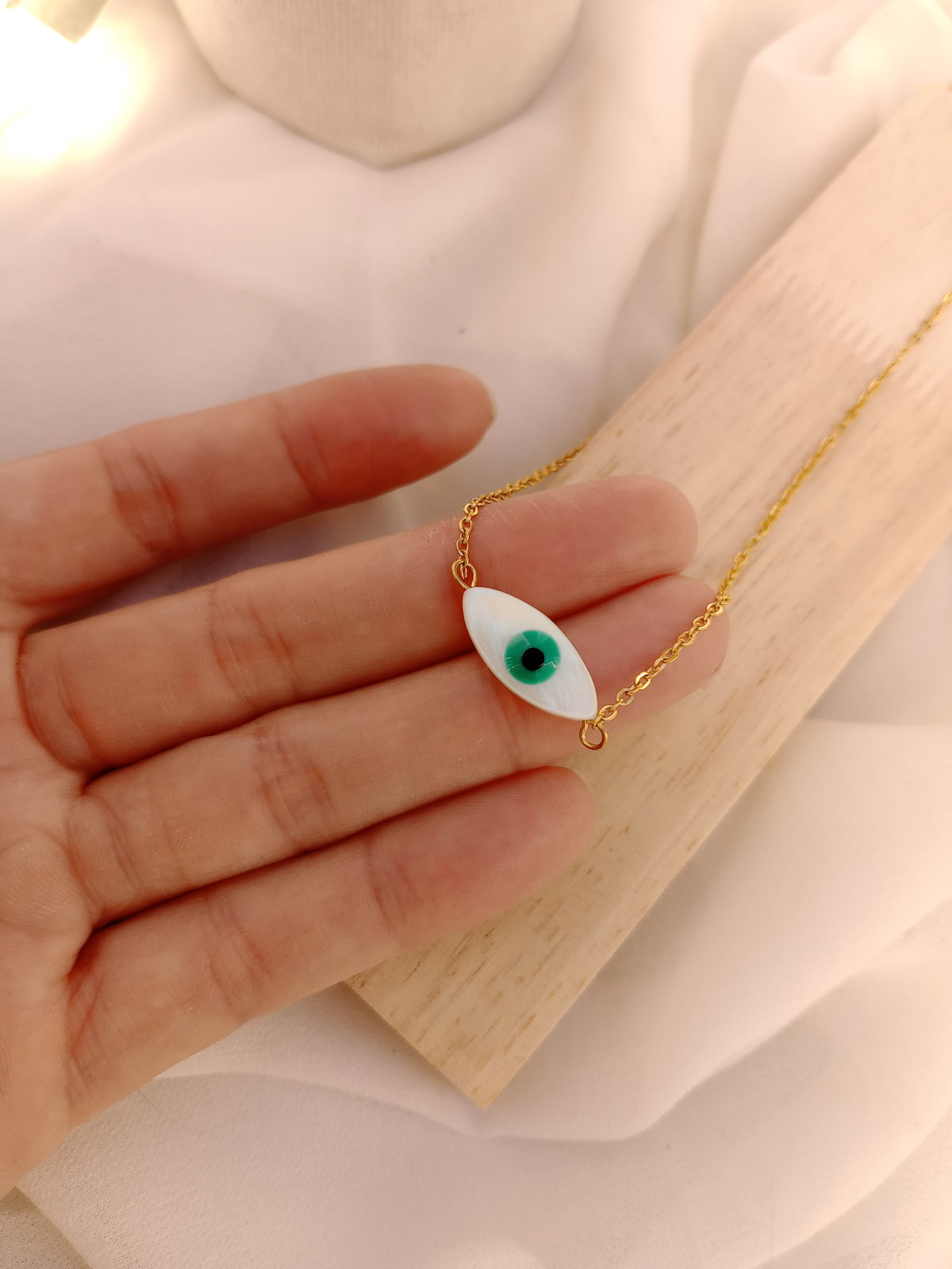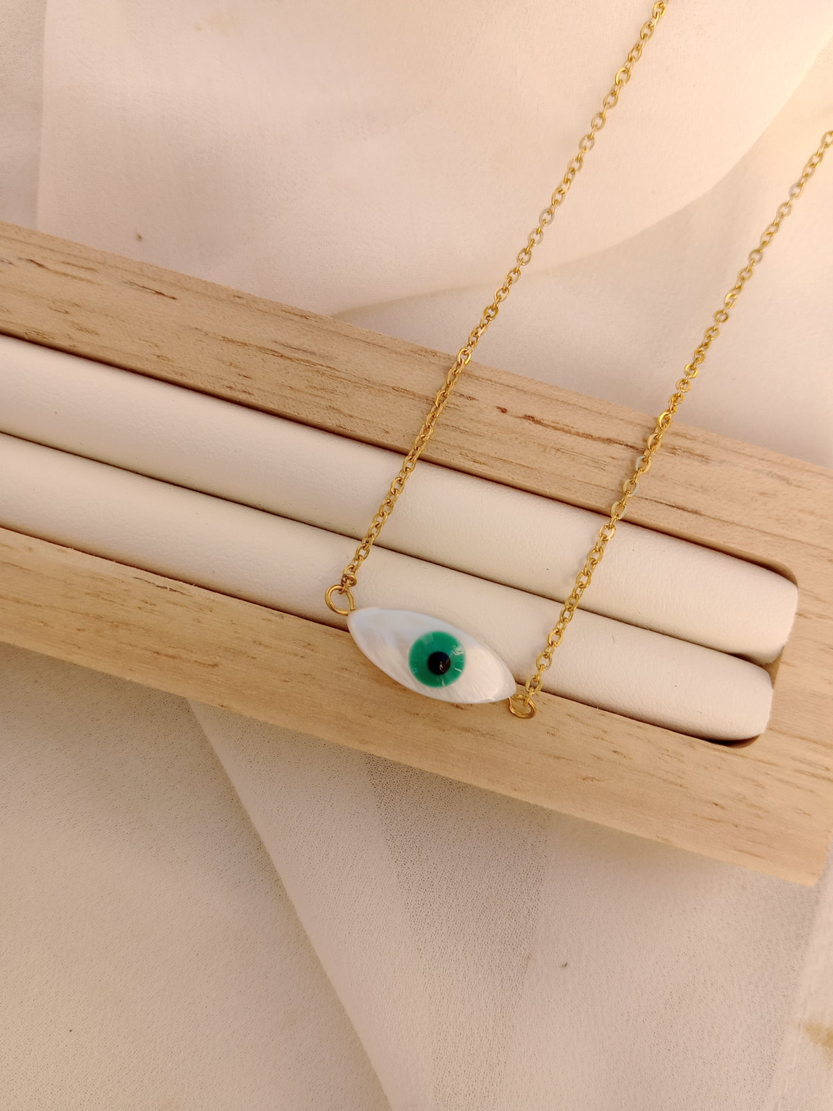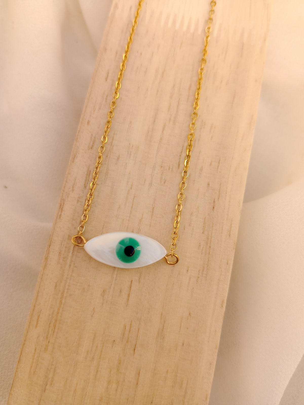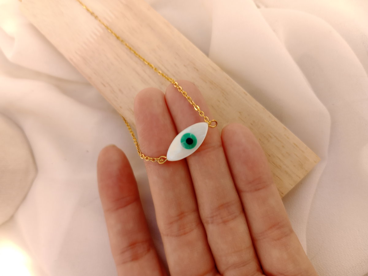 Protección y estilo en una sola pieza. Este collar presenta un dije de ojo turco en nacar blanca con iris verde, conocido por su poder protector contra las energías negativas. Cadena fina en acero dorado que le da un toque delicado y elegante. Perfecto para usar todos los días o regalar con intención