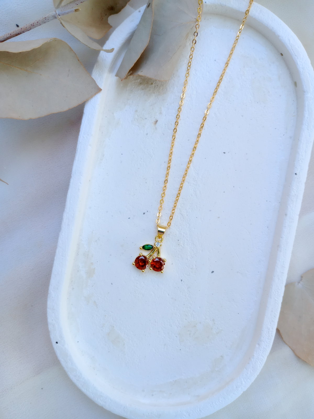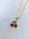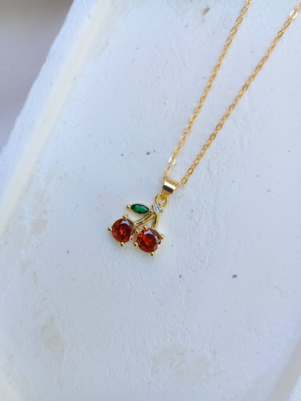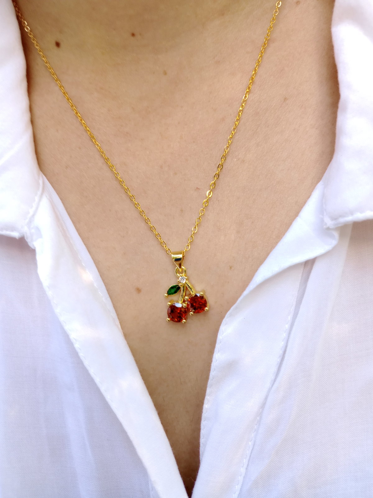 Colgante en oro laminado en 18 kilates. Cadenita estilo espejo, largo 45 cm de largo. Dije de cereza con cúbic en rojo y verde.