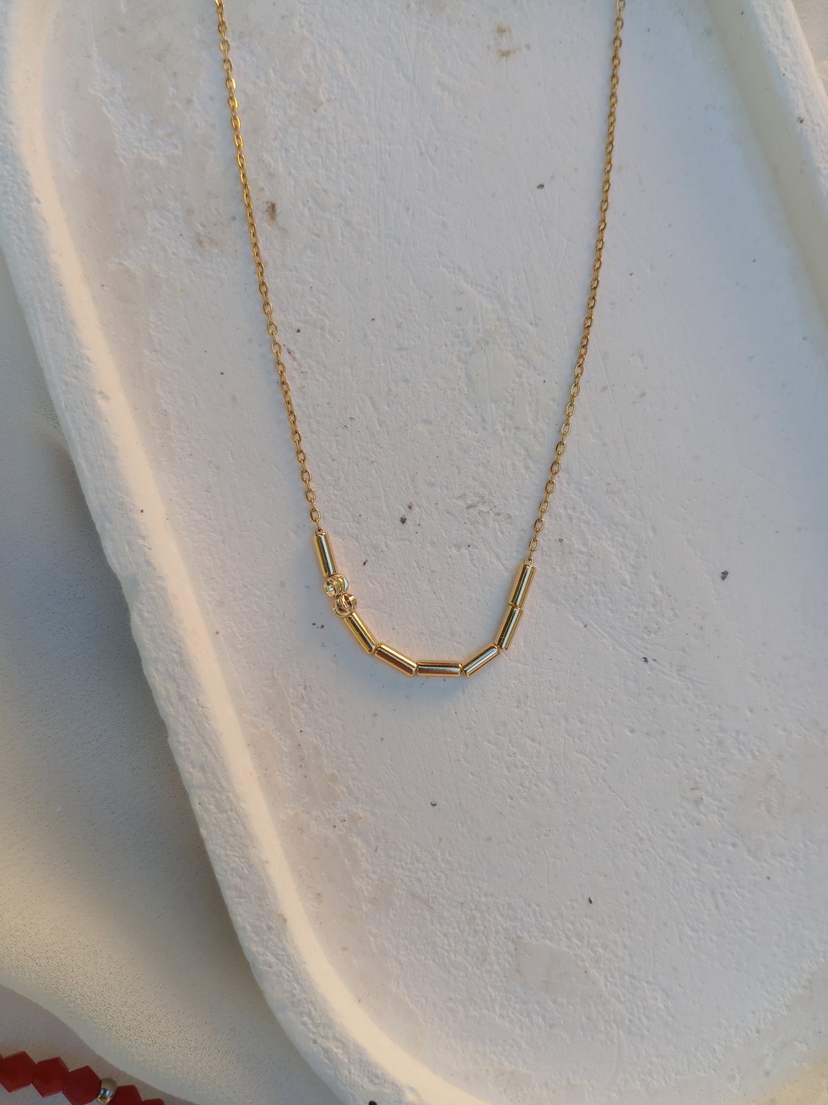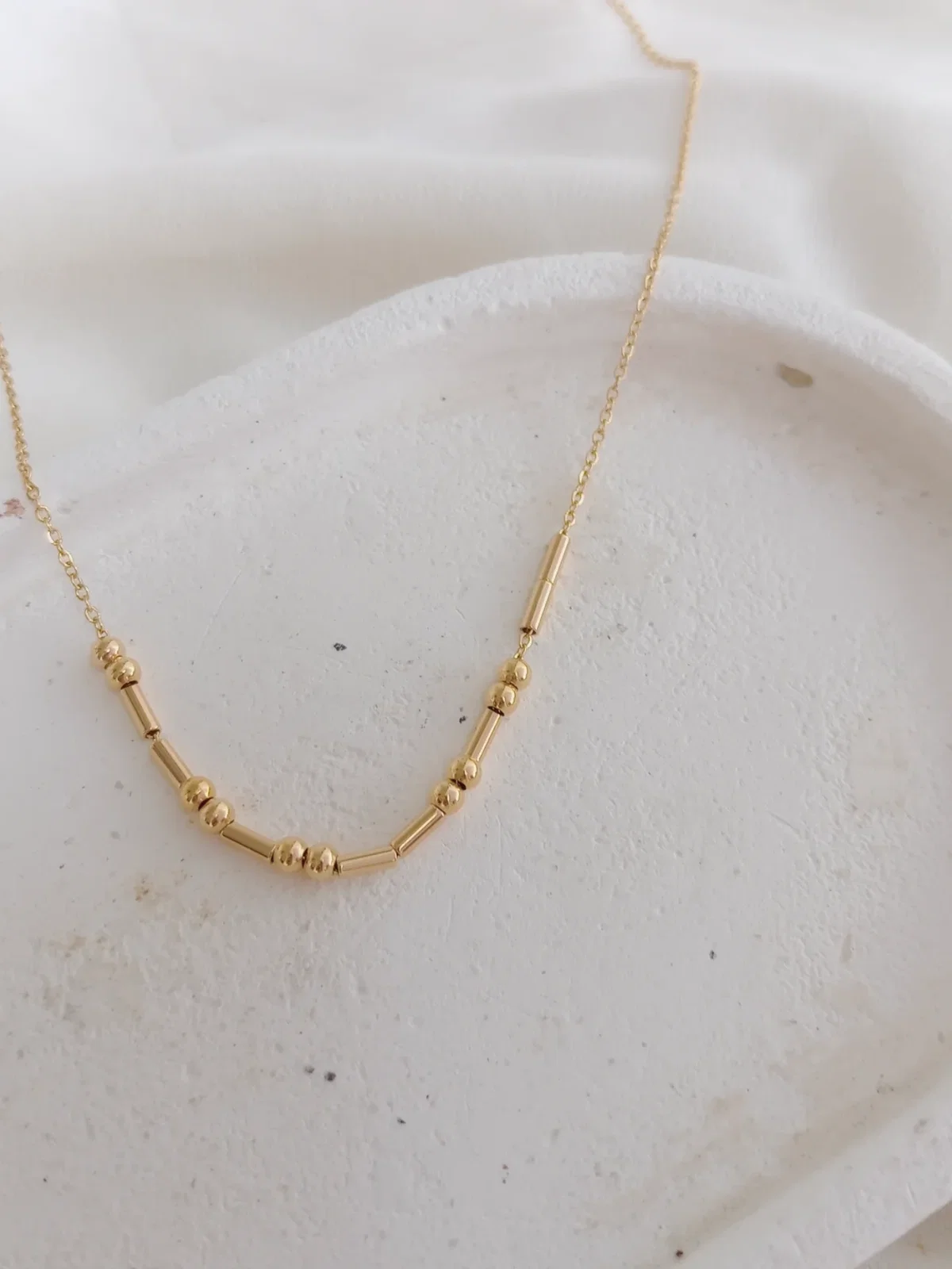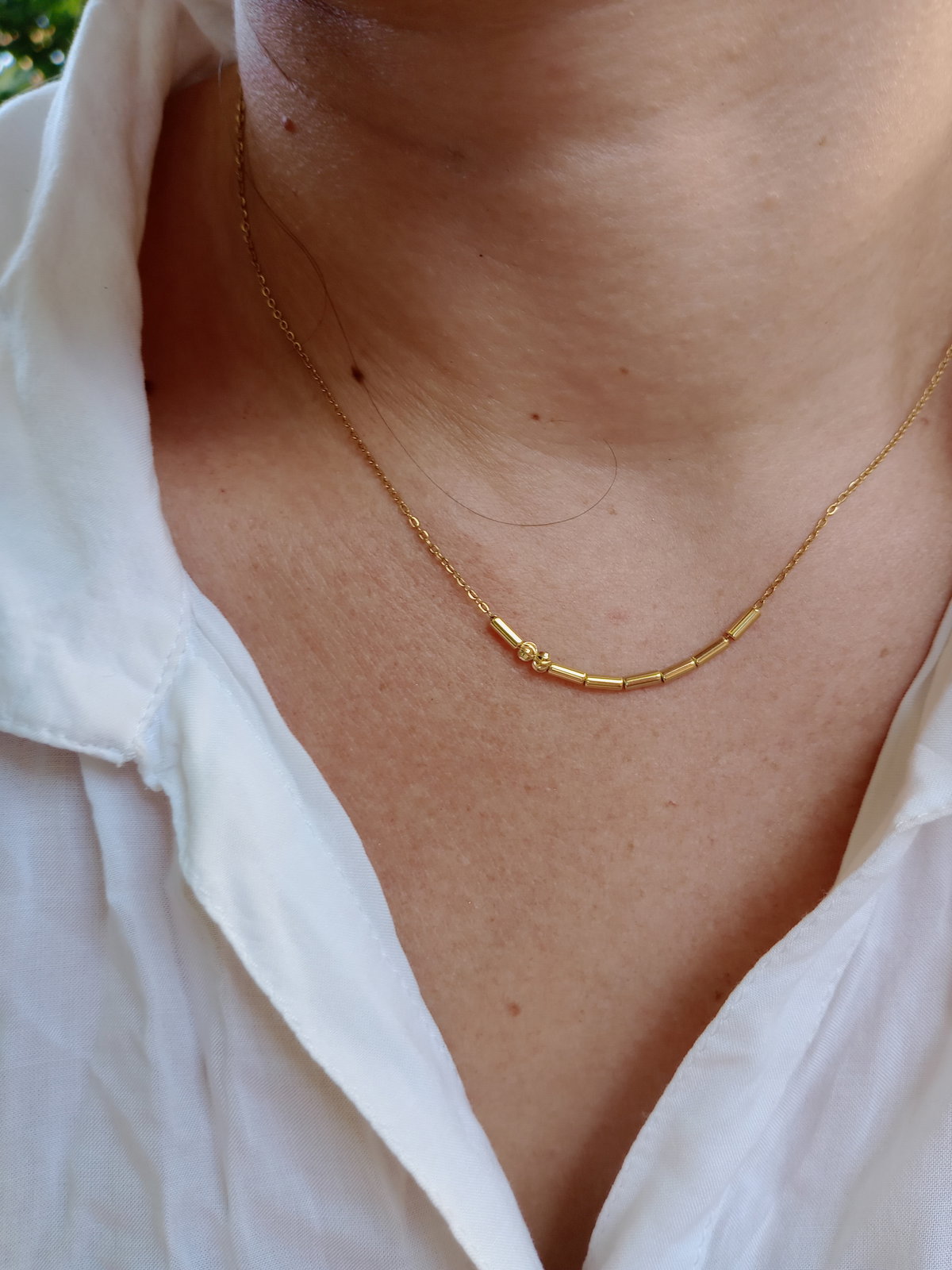 collar personalizado en Codigo Morse elaborado con formituras en oro laminado 18 k, y cadena fina de acero dorado, pensado para convertir recuerdos y nombres en una joya especial