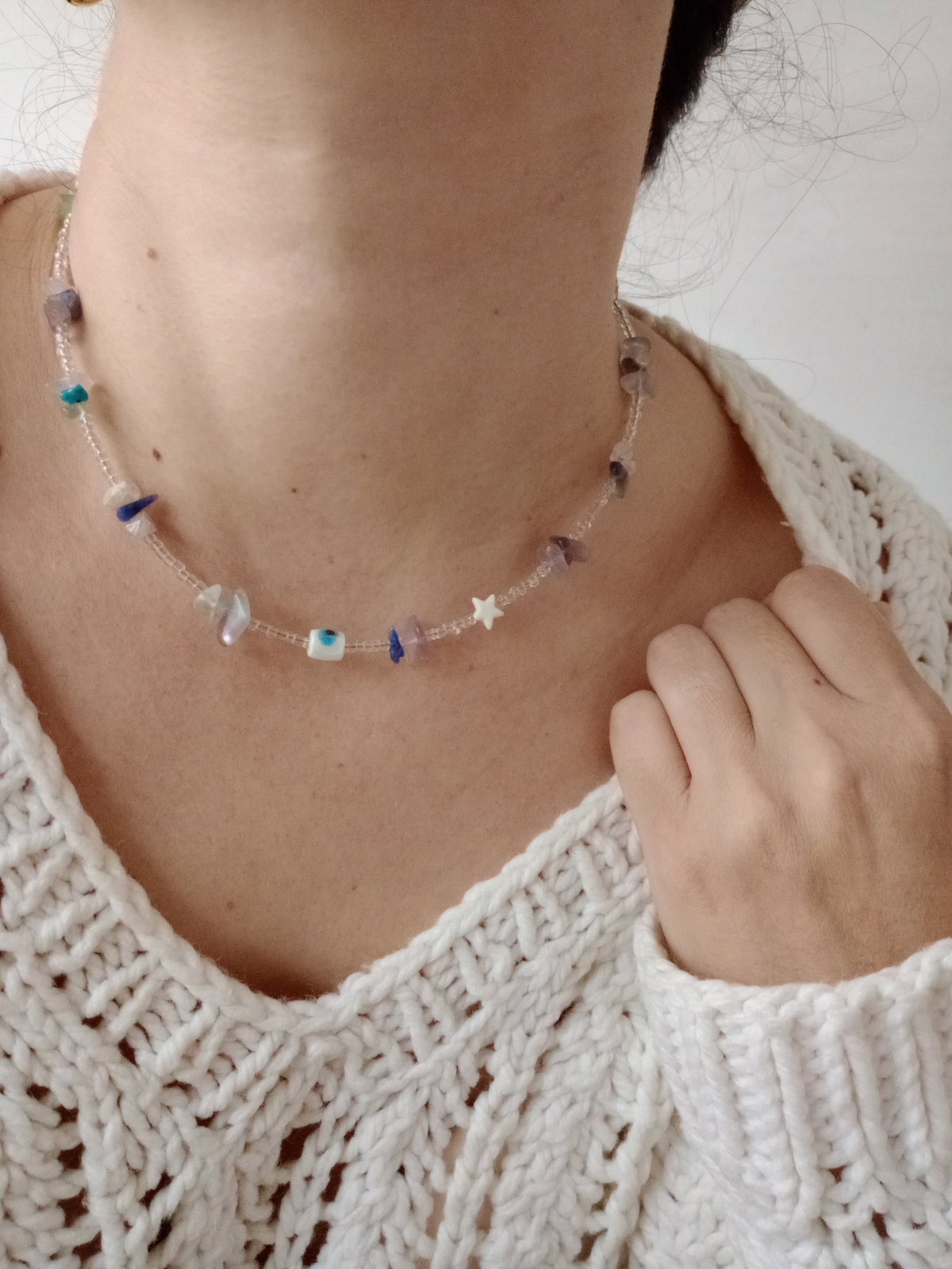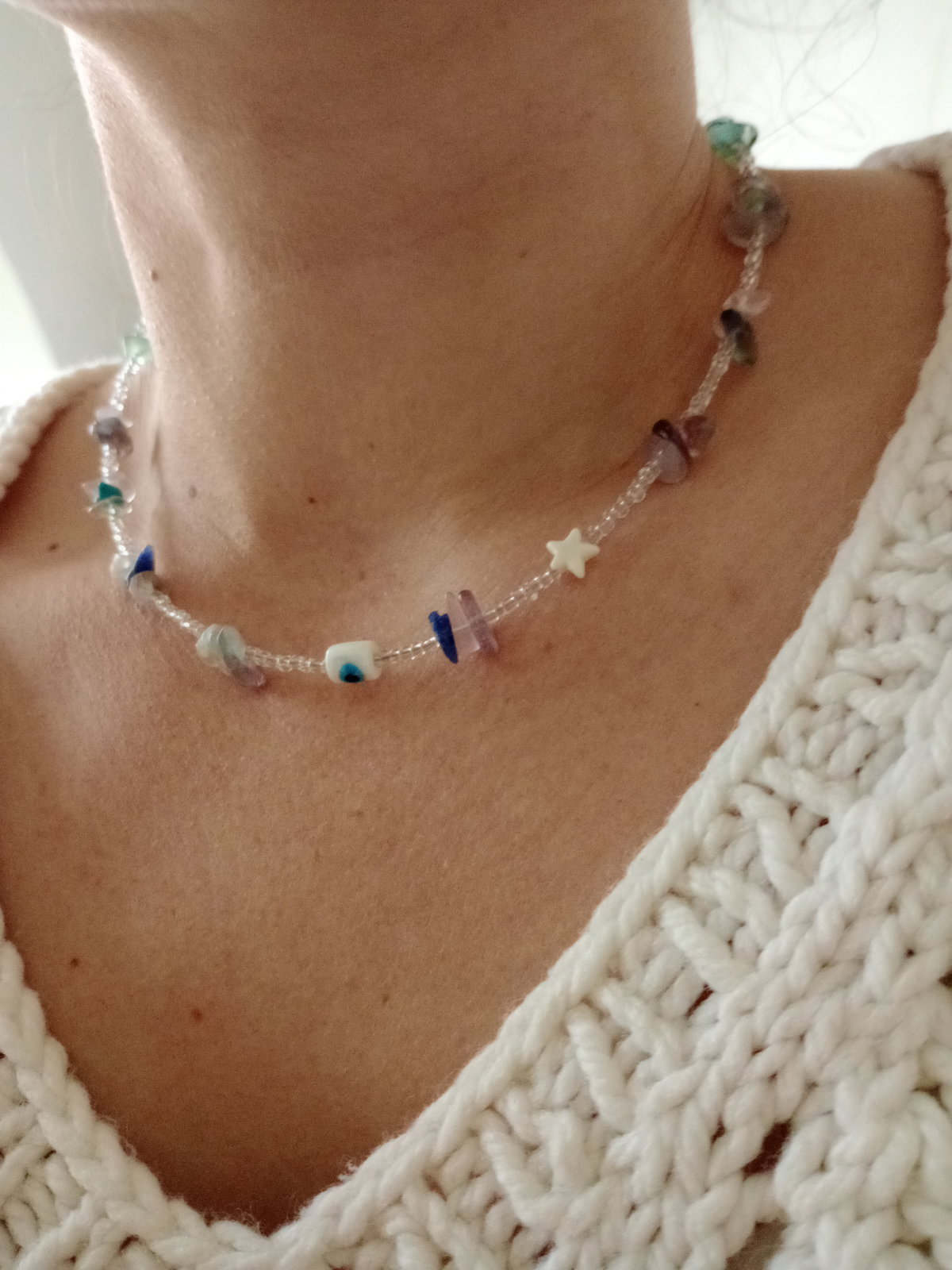 Priscila es una joya perfecta para el uso diario. Elaborada en acero quirúrgico y una combinación de piedras naturales Flourita multicolor, es hipoalergénica y resistente al desgaste. Su diseño bohemio con dijes la convierte en una pieza única que acompaña cambios, etapas y nuevos comienzos.