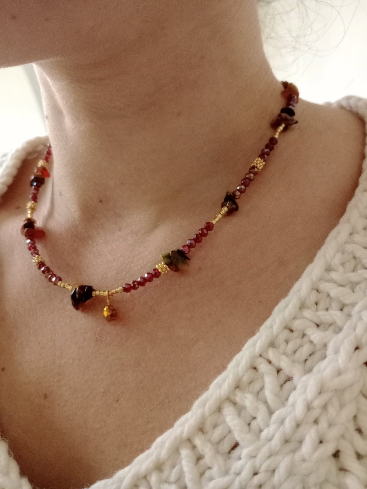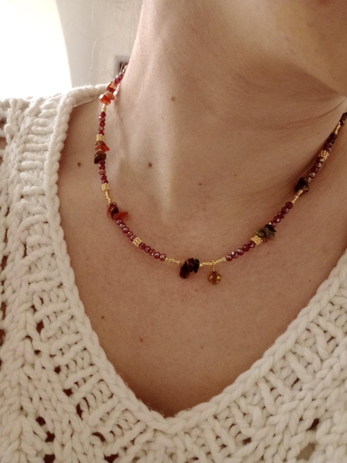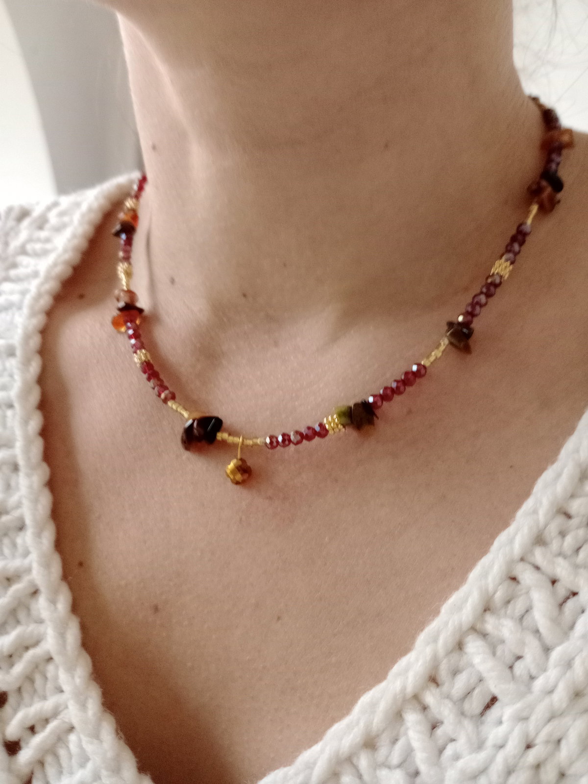 Rania es una joya perfecta para el uso diario. Elaborada en acero quirúrgico y piedras naturales en tonos tierra, es hipoalergénica y resistente al desgaste. Su diseño bohemio y cálido la convierte en una pieza ideal para conectar con lo esencial y complementar cualquier look otoñal.