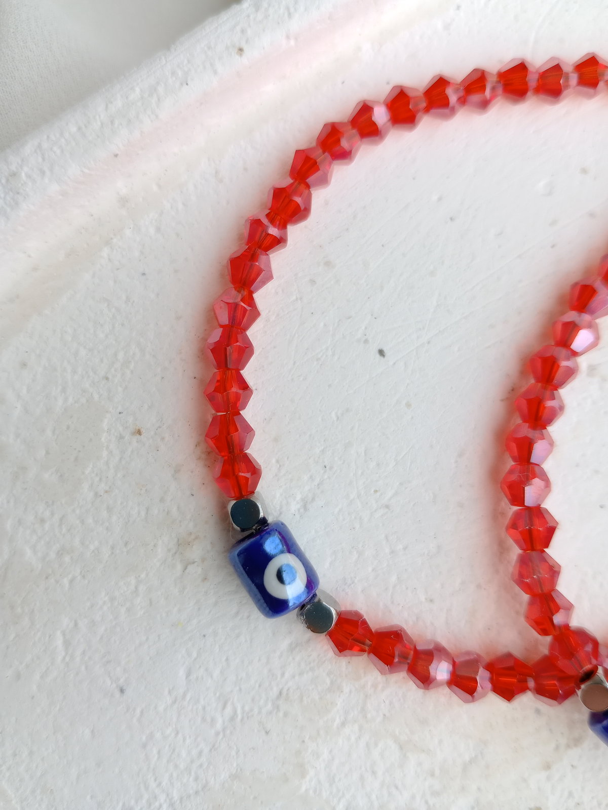 Esta pulsera combina la intensidad de los cristales rojos con el clásico ojo turco en cerámica, creando una pieza con fuerte presencia y significado protector.