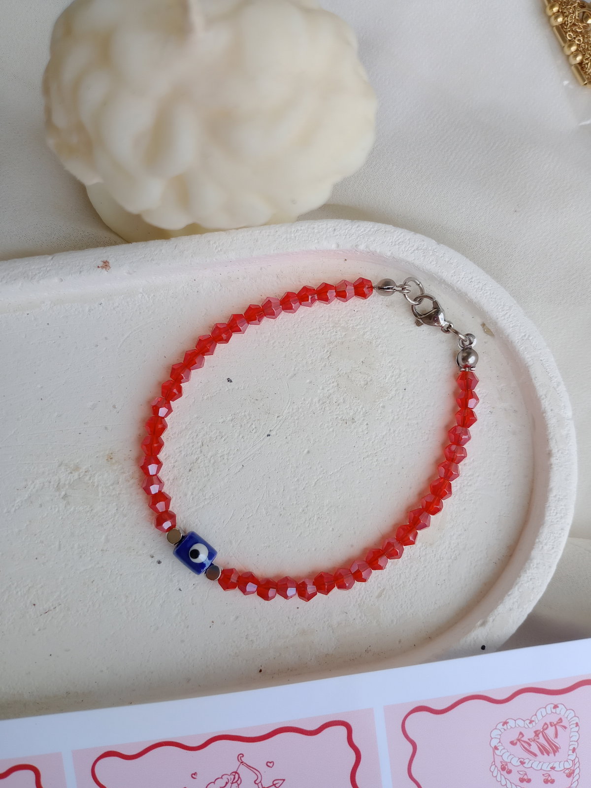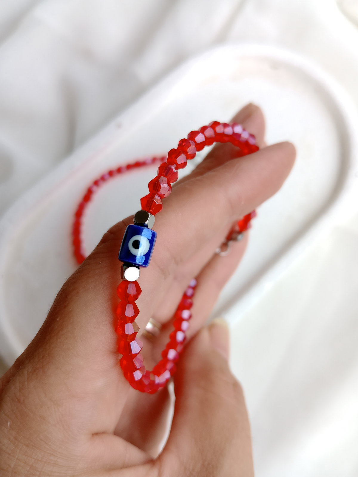 Los tonos rojos aportan energía y carácter, mientras el ojo turco actúa como símbolo de resguardo frente a las malas energías. Ideal para usar sola o combinar con otras pulseras.